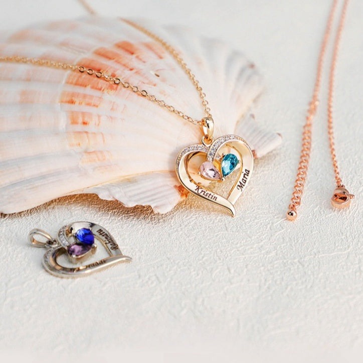 Personalized Forever Together Heart Pendant Necklace with Double Birthstones and Engraved Names Valentine's Day Gift for Women
