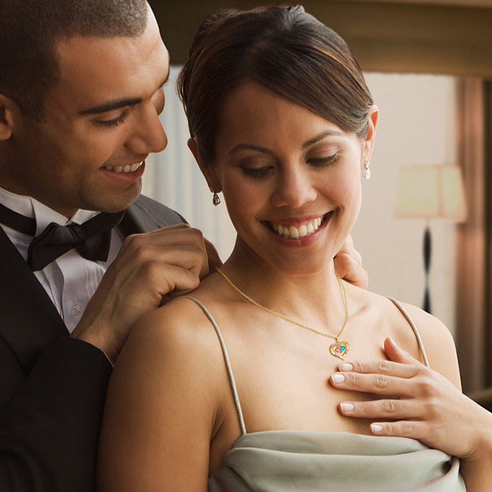 The heart pendant is adorned with two gleaming birthstones, each representing the couple's individual birth months. This thoughtful touch adds a deeply personal and meaningful element to the design, making it a truly unique and cherished keepsake. To further personalize this magnificent piece, the recipients' names are delicately engraved on the heart-shaped pendant, creating a one-of-a-kind work of art that celebrates the love and devotion they share.