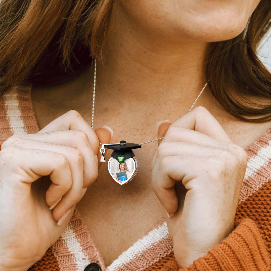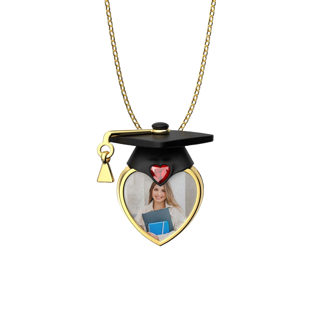 Our photo necklace captures the unforgettable moments of graduation. The pendant is designed in the shape of a heart-shaped graduation cap. The photo is customized in the pendant, The back of the pendant can be customized with two lines of copywriting to leave your good wishes, which is exquisite.