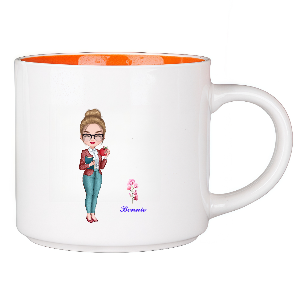 This mug features a customizable teacher's cartoon image,making it a meaningful keepsake,Make this mug truly unique by personalizing it with your choice of hair color, shoes color, skin, etc. for the character. You can also customize the name and birth flower to create a personalized keepsake that reflects the recipient’s style and interests.