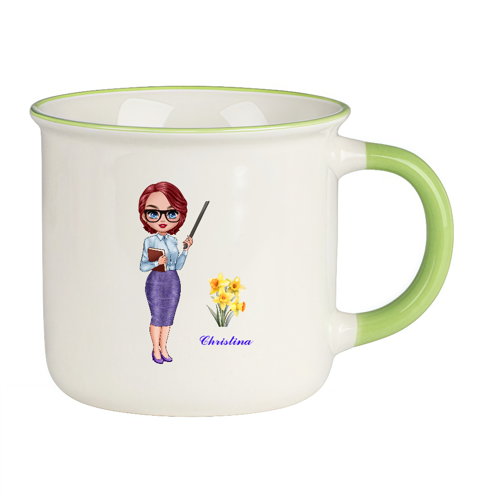 This mug features a customizable teacher's cartoon image,making it a meaningful keepsake,Make this mug truly unique by personalizing it with your choice of hair color, shoes color, skin, etc. for the character. You can also customize the name and birth flower to create a personalized keepsake that reflects the recipient’s style and interests.